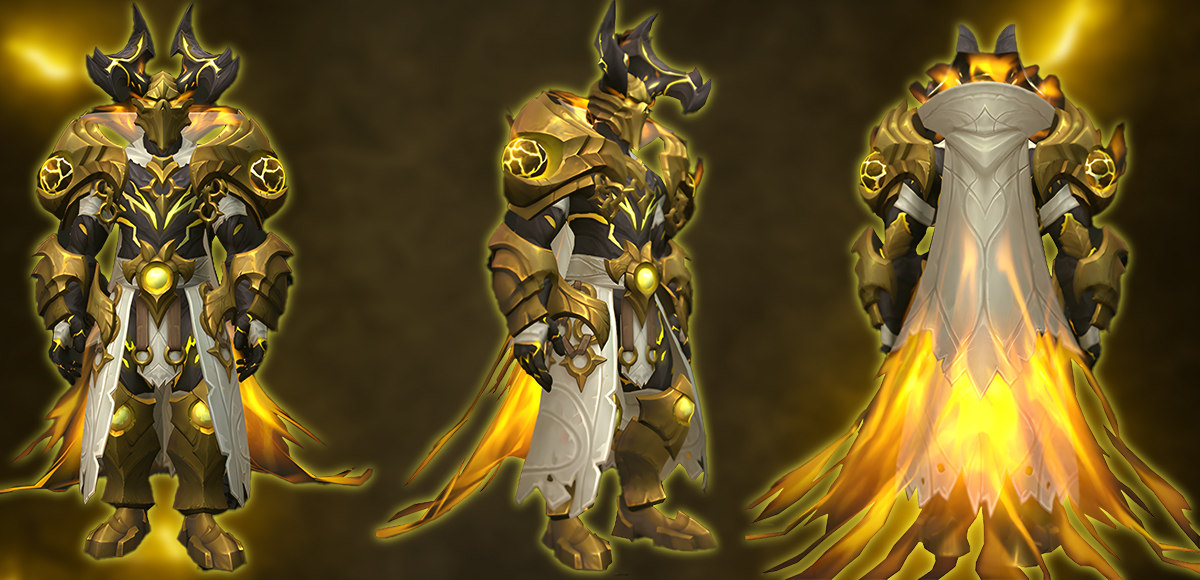 Lightbound Sargerei Commander Set is a radiant transmog ensemble wrapped in holy energy and Lightforged aesthetics. The armor shines with brilliant golden tones, white cloth details, and glowing flame effects trailing from the helm and cloak. Its sunburst motifs and armored silhouette give it the look of a battle-hardened paragon — a perfect match for Light-themed transmogs or righteous crusader fantasy.