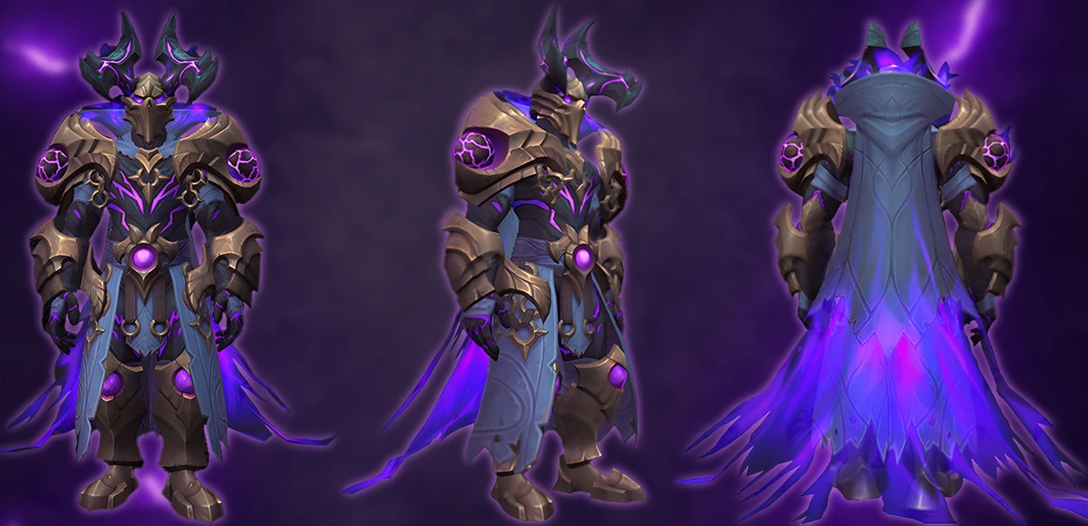 Voidscarred Sargerei Commander Set is a full transmog ensemble infused with the energy of the Void. It replaces Fel-green fire with glowing violet runes, dark bronze armor plating, and swirling purple energy streams flowing from the shoulders and cloak. The helm features twisting horns and a pulsing crown of Voidlight, while the cloak leaves a fading trail of amethyst smoke. It’s an ideal choice for players who want a darker, more mysterious twist on the Sargerei Commander look - elegant, sinister, and absolutely otherworldly.